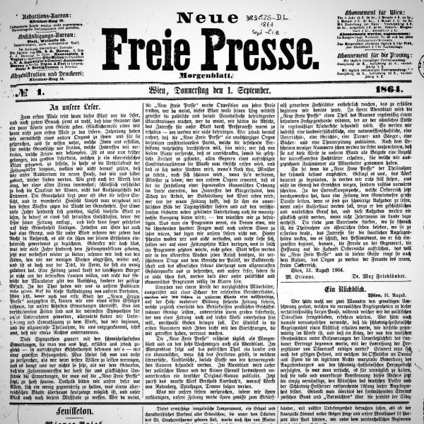 Period: 1864-1938. Year 1864. First edition of Neue Freie Presse. 01-09-1864. The most