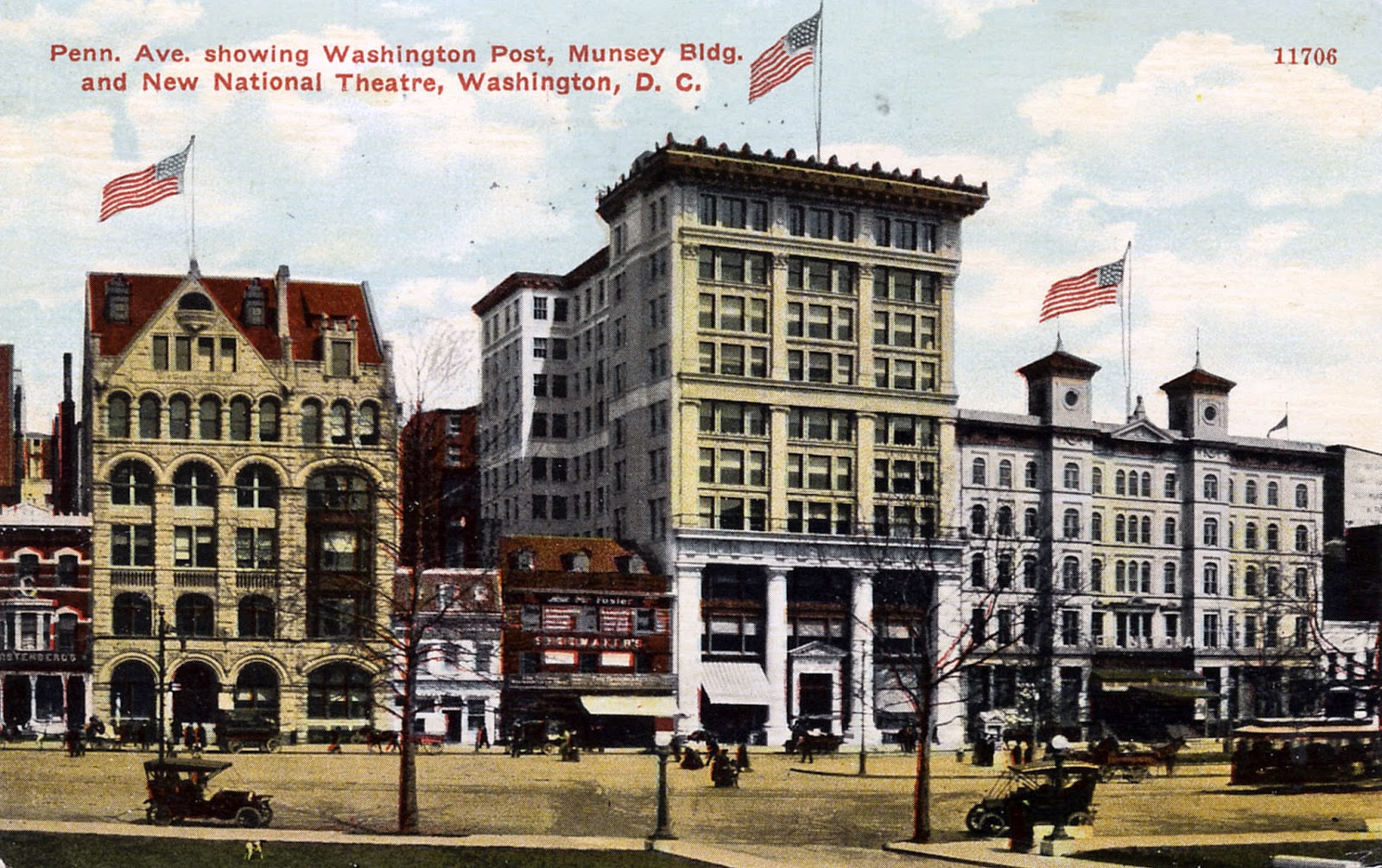 Year 1908National Theater. Penn. Ave. showing Washington Post, Munsey Bldg. and New National Theatre. Washington, D. C.