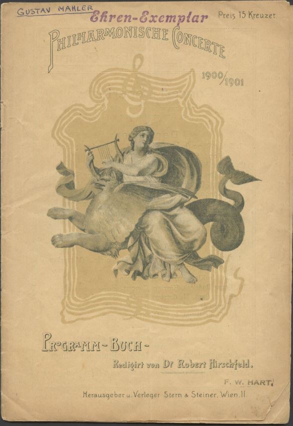 Rare program from a December 16, 1900 concert with members of the Vienna Hof-Opernorchester under Gustav Mahler, performing Beethoven’s Symphony no. 1, Overture to Coriolanus, and Symphony no. 4. 6 pp., including a list of the orchestra members and advertising. Small stamps and notes to the front wrapper. Toning and wear, with staple binding detached; overall very good. 5.5 x 8 inches (14 x 20.3 cm).