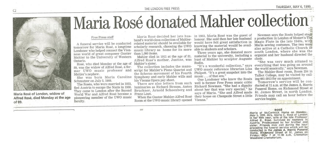 The Mahler-Rosé Collection was donated to The University of Western Ontario in October, 1983 by Maria Caroline Rosé-Schmutzer (1909-1999), widow of Professor Alfred Eduard Rose (1902-1975), who was the nephew of composer Gustav Mahler and the son of Arnold Rosé (Concertmaster of the Vienna Philharmonic Orchestra, and leader of the Rosé String Quartet).