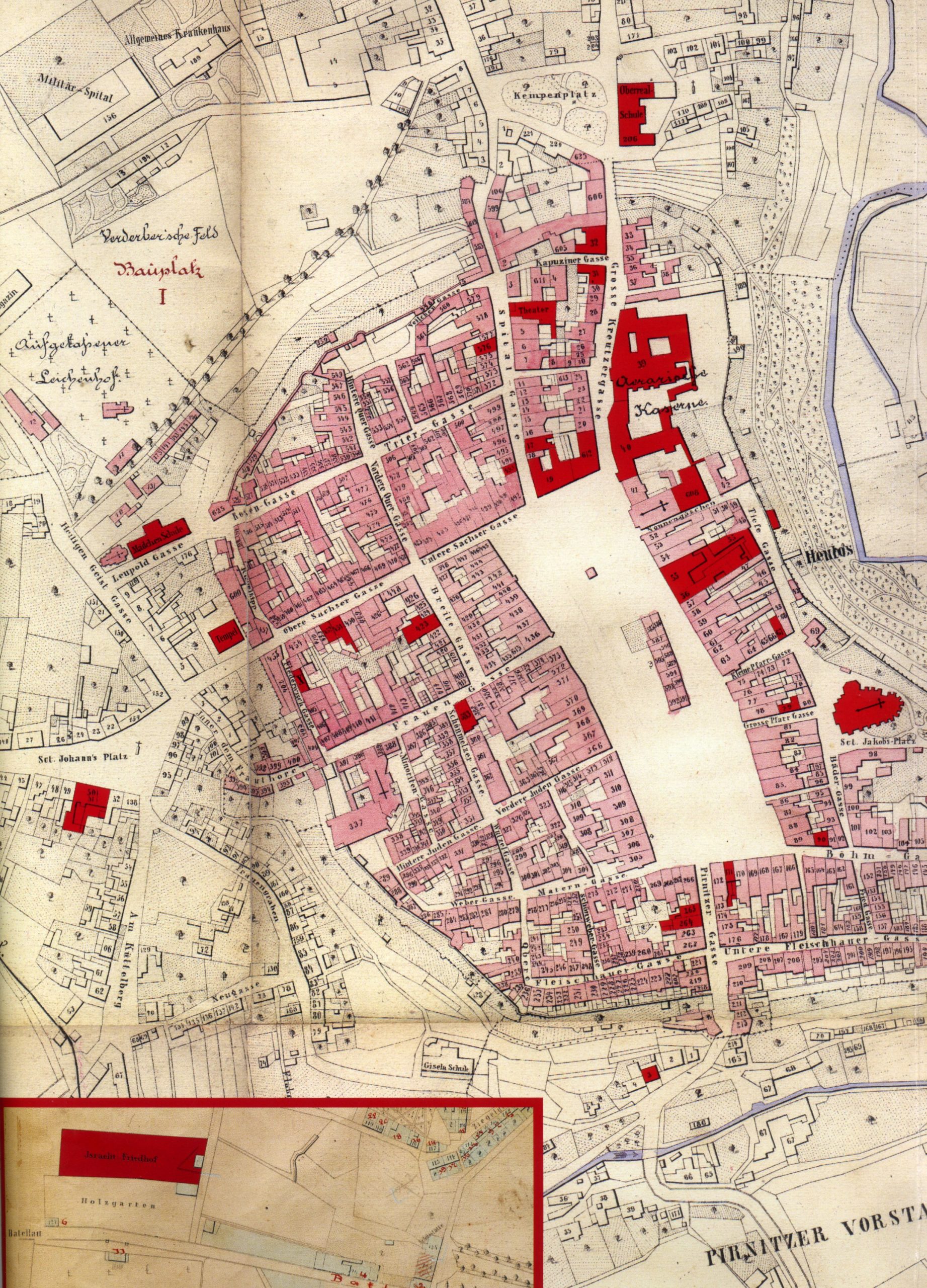 Detail of the map of Jihlava (Plan der Stadt Iglau nach der neuesten Vermessung, Iglau, August Illing 1876) indicating places associated with Gustav Mahler and his family.