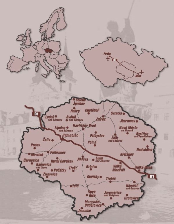 The name of the Vysocina Region (Kraj Vyso?ina or “Highlands Region”) derives from the name of the Ceskomoravska vrchovina (Bohemian-Moravian Highlands), a hilly, undulating countryside situated between the two historical lands of the Czech Republic. Vysocina reaches over 800 meters in altitude, in the two distinct mountain ranges of Zdarske vrchy in the north of the region and Jihlavske vrchy in the south-west. The main European water divide, echoing the former frontier between Bohemia and Moravia, divides the region into two parts almost equal in area. Bordering the South-Moravian Region to the east, the South-Bohemian and Middle Bohemian Regions to the west, and sharing a border with the Pardubice Region to the north-east, the region is situated in the very heart of the Czech Republic. The economy of the region’s eastern part is influenced by the neighbouring urban centre of Brno, while the north-eastern part is within the sphere of influence of the capital of Prague.