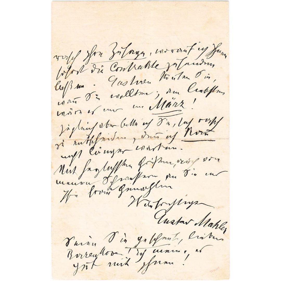 … first. Vienna is no more expensive than Hamburg – on the contrary: anyone who lives here constantly (and not as a stranger in the Hotels, who are however more expensive than in Hamburg) gets through much cheaper and lives more comfortably, bourgeois. The audience carries their artists on their hands, and especially their way of singing is cheered here. – Personally, I am also flattered to be able to contribute to your welfare (especially artistically). Just think of the advantages for you of finally not being overexerted, which is out of the question here, really allowing all of your tasks to mature and being worked out down to the last detail – and, last but not least, all in one, worthy of you To be able to live in the surrounding area – that you will sing here for ten years longer than anywhere else in the world is without a doubt: just ask about the Anna Bahr-von Mildenburg (1872-1947) that was just here, or the humility of the just completed, and the Viennese conditions exactly knows. Secondly, after major difficulties, I have been able to achieve the following conditions for you. From the 2nd year a fee of 24,000 guilders and 4 weeks of winter vacation. Remember that you can use your summer and winter holidays here for your bag and not for Pollinis [the director of the Hamburg Theater, Bernhard Pollini (1838-1897), and that you can also easily get off contractually here, south, you are better off here than you can reach anywhere else. – I beg you non, dear friend, take hold and telegraph your promise quickly, and I will have the contracts sent to you immediately. You could gastrene if you want; I would love it in March! … be shy, dear Wilhelm Birrenkoven (1865-1955)! I mean well with you! “.